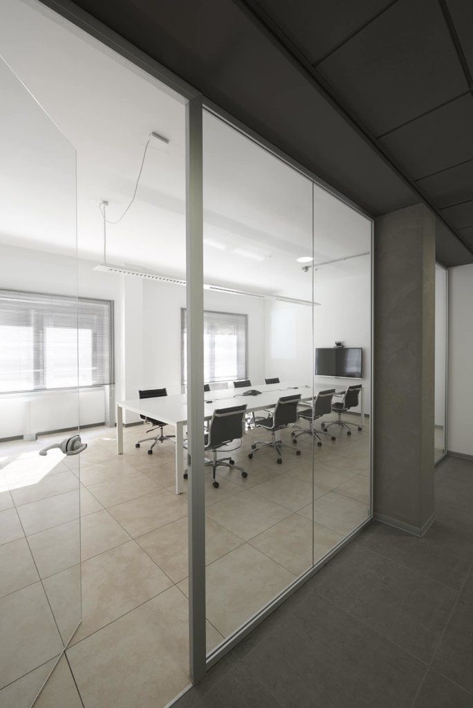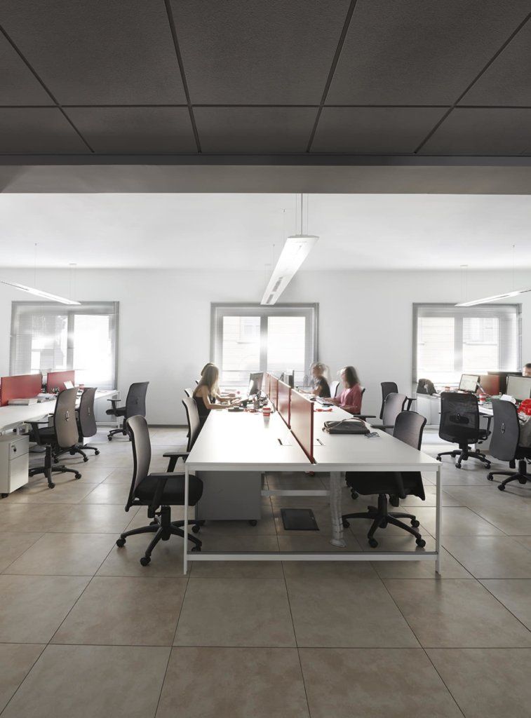 Total white K-word workstations with accent tone on the screen in red colour, identifying the company logo, to arrange multiple workstations that optimize the available space, workflows and communication between people.The colour was used to recall the corporate identity, enhancing brand experience also among the collaborators, who perceive to belong to the company.