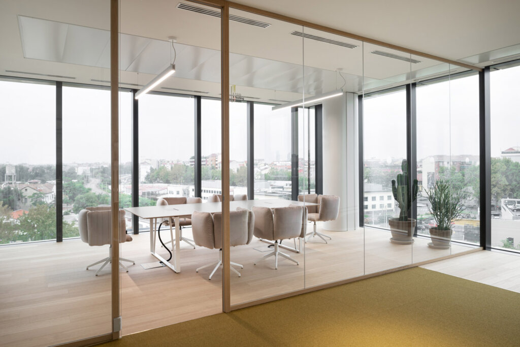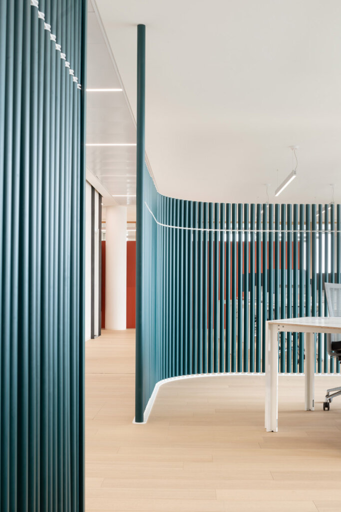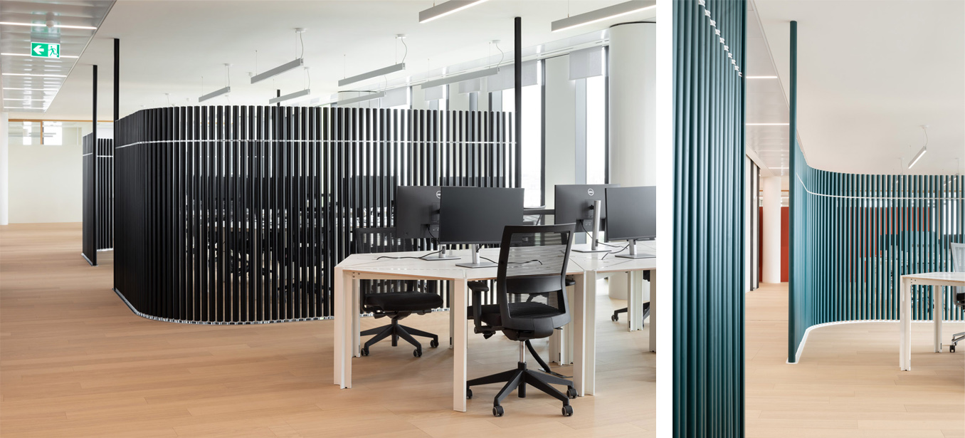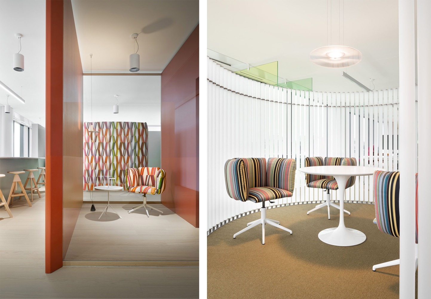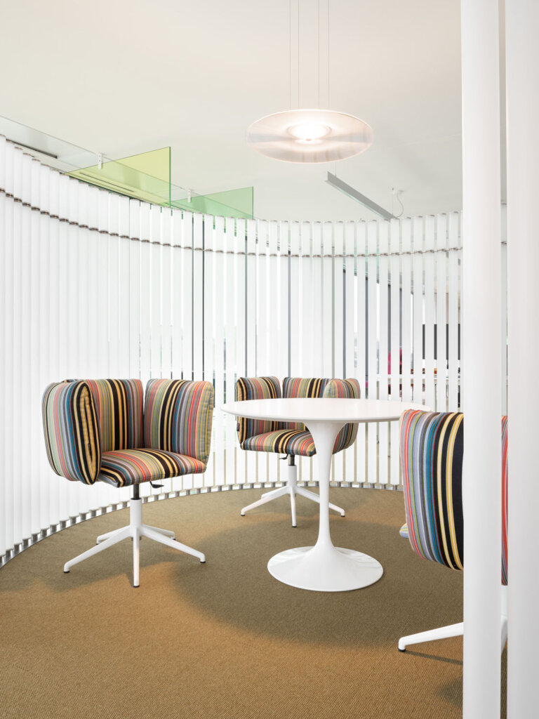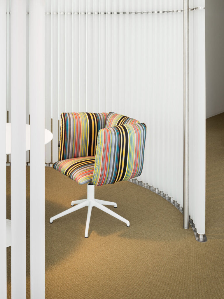 Su ogni livello dell’edificio si integrano “hard spaces e soft spaces”, due macro gruppi di aree con caratteristiche opposte ma complementari. Per gli “hard spaces”, definiti dalla connotazione tradizionale di ufficio in cui sono indispensabili sale riunioni, uffici open, uffici singoli, aree lounge e aree break, sono state scelte le poltroncine basse girevoli con comodo schienale imbottito della collezione “Undecided”, disegnate da Raffaella Mangiarotti e Ilkka Suppanen, sia con rivestimenti grigi tinta unita che con cover molto decorative come le millerighe di Paul Smith o pattern grafici di Pierre Frey.