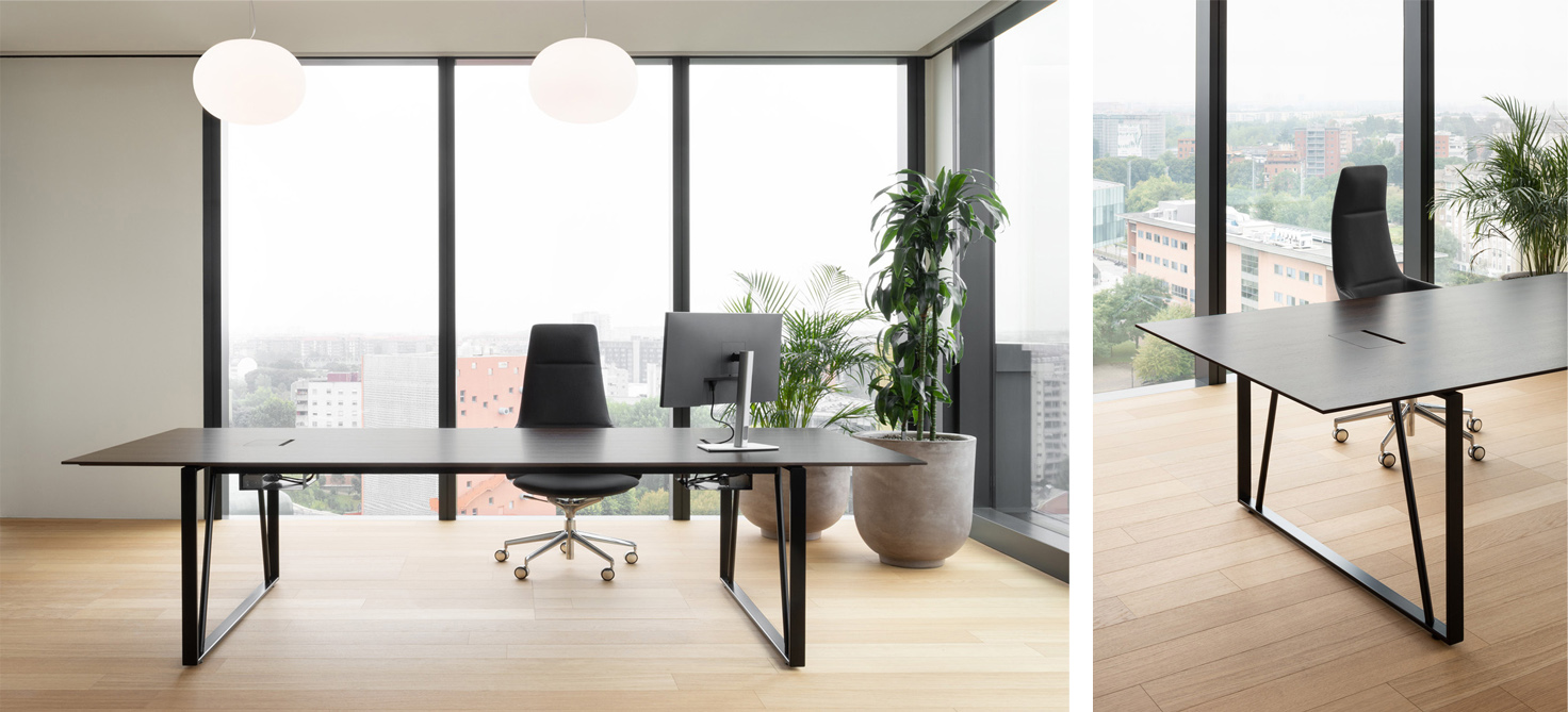 E’ stata disegnata con deamicisarchitetti anche una serie di workstation con sottile piano in multistrato rivestito in essenza rovere sbiancato, rovere rigatino o eucalipto affumicato e strutture verniciate nero opaco e bianco opaco dotate di box prese nella parte sottostante, accessibili attraverso uno sportello integrato a filo piano. I desk, in differenti dimensioni, sono caratterizzati da eleganti e sottili gambe in metallo verniciato a polveri coordinate al piano.